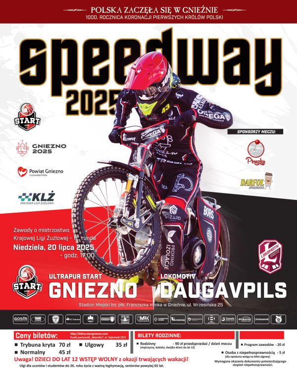 Ultrapur Start Gniezno pozostaje w dobrych nastrojach. Po wysokim zwycięstwie ze Speedway Kraków (33:57) morale zdecydowanie wzrosły i zawodnicy są gotowi do dalszej walki o końcowe miejsce. W awizowanym zestawieniu nie doszło do jakiejkolwiek zmiany względem meczu z Trans MF Landshut Devils. Kevin Fajfer znalazł się pod numerem dziewiątym i stworzy parę z Casperem Henrikssonem. Sam Masters tradycyjnie założy na plecy metalowy numer jedenasty, przez co otworzy mecz z naszym wychowankiem – Kevinem. Pod numerem dwunastym widnieje Adrian Gała, którego na gnieźnieńskim torze nie widzieliśmy od domowego meczu z Speedway Kraków. Polak w Daugavpils okazał się ważnym ogniwem, ale w najbliższą niedzielę może nie wyjechać na tor. Adam Ellis, który odnalazł formę po wzlotach i upadkach z początku sezonu, zajmie numer trzynasty. Para młodzieżowców to Marcel Juskowiak i Patryk Budniak, gdzie ten pierwszy brał udział w poważnie wyglądającym upadku podczas zawodów U24 Ekstraligi. Marcel nie doznał jakichkolwiek złamań i jest gotowy do jazdy. Przypominamy, że w dzień meczowy można uzupełnić skład meczowy i pod numerem szesnastym na pewno zamelduje się Bastian Pedersen.