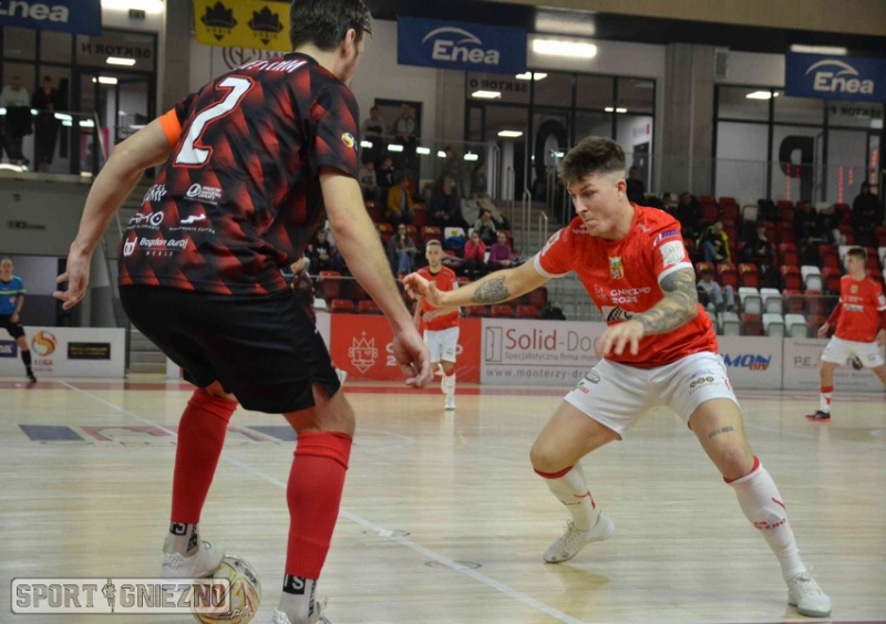 Czerwone Diabły to spadkowicz z ekstraklasy, który jednak przed sezonem był uznawany za faworyta rozgrywek w grupie północnej. Te przewidywania nie do końca sprawdzają się w rundzie jesiennej. Chojniczanie po dziewięciu meczach zajmowali piątą pozycję w ligowej tabeli z dorobkiem 16 punktów. W ostatniej kolejce przegrali wysoko 3:8 z liderującą Wiarą Lecha. W Gnieźnie początkowo jednak przeważali spychając gospodarzy do defensywy. W 8 minucie chojniczanie objęli prowadzenie, a trójkowy atak strzałem z trzeciego metra do pustej bramki gospodarzy zakończył Oleh Kryvko. W odpowiedzi bliski wyrównania był Lubomir Kołomyjczuk decydując się na indywidualny atak środkiem boiska. Gnieźnieński zawodnik zbiegając w prawą stronę uderzył silnie trafiając jednak tylko w boczną siatkę bramki gości. W 14. minucie goście egzekwowali zrzut wolny z około dziesięciu metrów. Przed rozegraniem tego stałego fragmentu gry trener Oleh Zuzula poprosił o czas i rozrysował swoim zawodnikom schemat rozegrania tej akcji. Był on bardzo zaskakujący dla gospodarzy, ale finalnie piłkę tuż sprzed linii bramkowej zdołał wybić Oliwier Heliasz. Generalnie jednak w drugiej części pierwszej połowy to gnieźnianie przeważali konstruując coraz groźniejsze akcje, a wręcz spychając rywali do defensywy. W 16. minucie napór gnieźnian zaowocował zdobyciem wyrównującej bramki. Zagranie z prawego skrzydła na szósty metr wykorzystał Olaf Wójtowicz kierując piłkę do bramki między nogami Aleksandra Kufla. Do przerwy było zatem 1:1. Po zmianie stron gospodarze nadal dominowali. Kolejne okazje mieli Dawid Radomski, Lubomir Kołomyjczuk i Kamil Kijak. W 35. minucie powinno być 2:1. Dwa strzały w odstępie kilkunastu sekund oddał Wojciech Węgrzyn ale dwa razy skutecznymi interwencjami popisał się Aleksander Kufel. Przy czym za pierwszym razem w sytuacji „sam na sam”. Dwie minuty później z prawego skrzydła przymierzył Kamil Kijak ale bramkarz gości znów popisał się skuteczną interwencją. Goście grali głównie z kontry i po jednej z takich akcji Gualadi Kokoładze strzelił drugiego gola dla Red Devils. Sędzia Adam Heliasz natychmiast poprosił o czas i jak można było spodziewać się, sztab trenerski podjął decyzję o zastępowaniu bramkarza piątym zawodnikiem. Uprawnienia bramkarza miał Wojciech Węgrzyn. Gnieźnianie znakomicie rozegrali atak pozycyjny i już niespełna minutę później zdobyli wyrównującego gola, a na listę strzelców wpisał się Filip Kruczyński pakując piłkę do bramki z bliskiej odległości tuż przy lewym słupku. Gnieźnianie ruszyli jeszcze do ataku licząc na zwycięstwo, ale nie zdołali rozstrzygnąć spotkania na swoją korzyść.